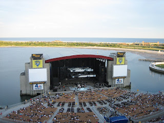 I had never been to Jones Beach but heard it was a cool concert venue. That would be an understatement. Let's just talk about the mere fact that the stage sits in the water. In a bay type area very Dawson's Creek-esque. And the seats? Yep, they overlook this bay, as well as the ocean. With the sun setting in high 70s temps? Beautiful, excellent, awesome, lovely. And really, if you had asked me my idea of an ideal summer in "the real world," I would have to say that weekend beach/concert trips with my best friends would definitely be exactly what I would say. I mean, other than somehow NOT working and just sitting around all day every day at a beach/pool/lake. But let's be reasonable.